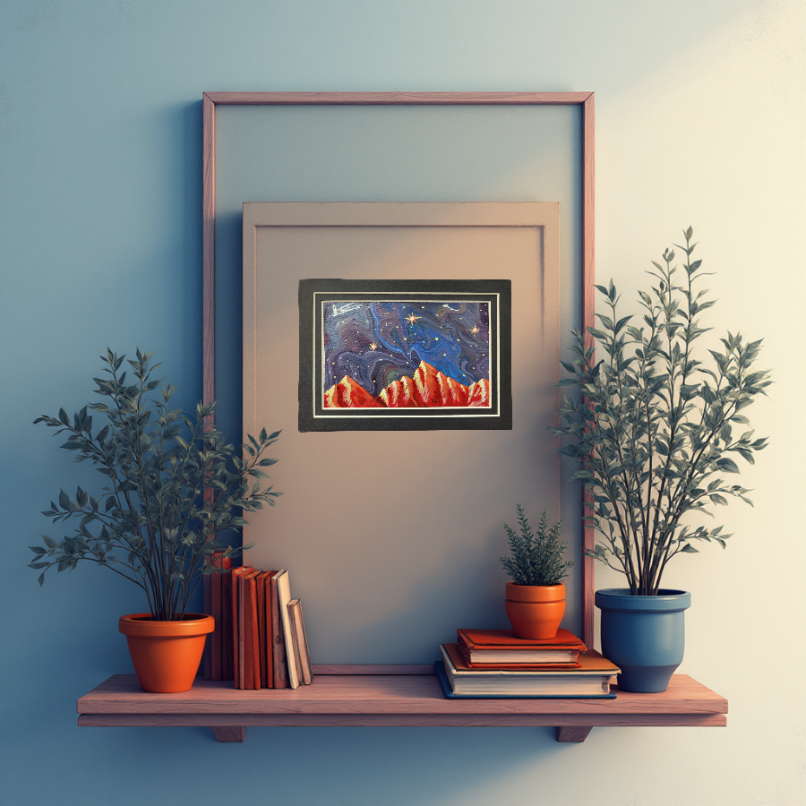 The heavens glow with molten hues, spiraling gently around starlight that feels both comforting and mysterious. Stark winter trees curve inward, cradling the glowing sky as it sweeps across the mountains. This piece hums with a soft, fiery calm—a dreamscape where the cold sparkles and the night feels warm.